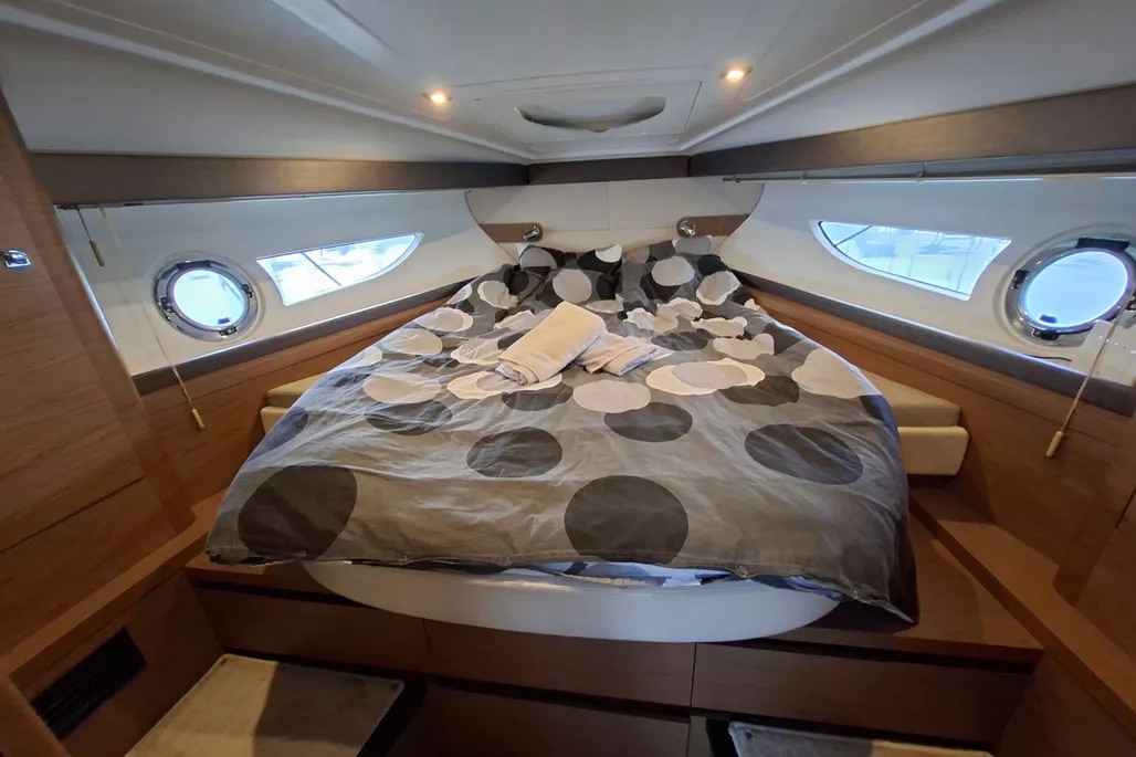 L’intérieur est un modèle de raffinement avec un carré transformable, une climatisation réversible, une télévision et une cuisine équipée (réfrigérateur 42L, micro-ondes, feux gaz, évier inox et chauffe-eau 40L). Le pont n’est pas en reste : toit ouvrant électrique, plateforme de bain rallongée, douchette (chaud/froid) et un second réfrigérateur de 30L pour vos journées au mouillage.