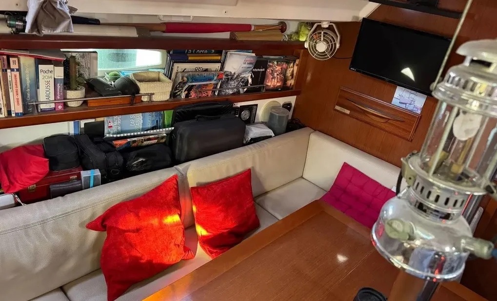 Équipé d’une quille longue pour une stabilité exemplaire, il dispose d’un jeu de voiles complet (GV enrouleur, génois Profurl, gennaker, tourmentin sur étai largable). Sa propulsion est assurée par un moteur Yanmar 3YM30, totalisant 1200 heures, avec hélice Maxprop et un propulseur d’étrave Sleipner pour des manœuvres en toute sérénité.