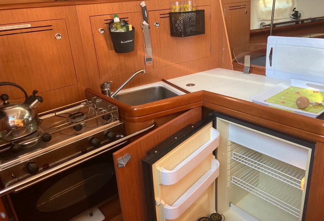 Confort à bord : Sellerie avec sous-matelas anti-condensation, chauffage 220V, eau chaude (moteur/quai), cuve à eaux noires. Cuisine équipée (Four Eno, frigo 12/220V).