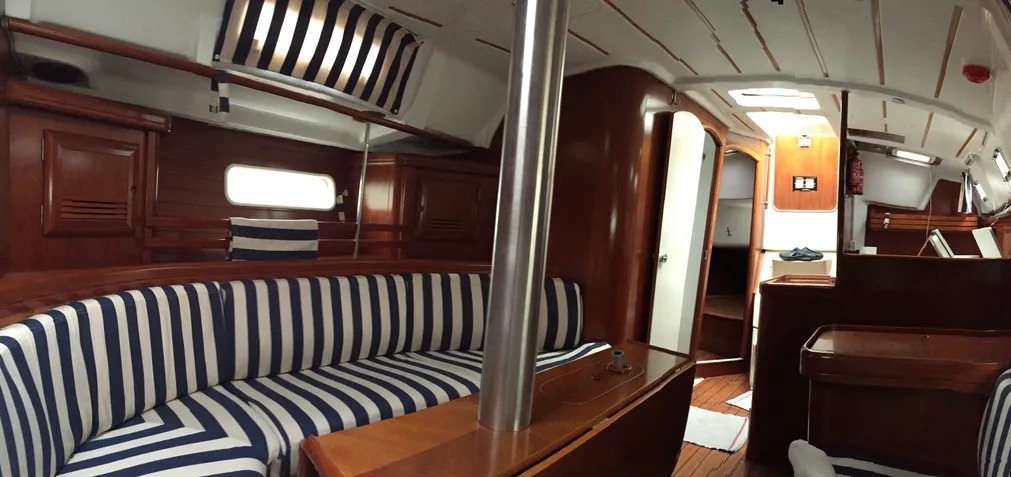 Équipé d’origine d’un propulseur d’étrave, il se déjoue des ports encombrés avec une facilité déconcertante. L’aménagement intérieur propose une vaste cuisine en L, tandis que l’immense coffre de cockpit bâbord accueillera sans peine tout votre matériel de plongée, de pêche et vos voiles.
