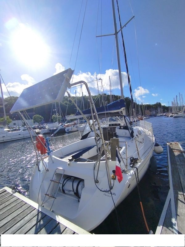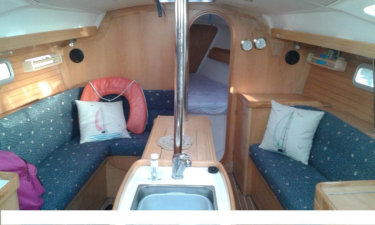 Côté électronique, il est doté d’une centrale de navigation Raymarine st40 (loch/sondeur/anémo), d’un GPS Magellan et d’un pilote automatique SIMRAD TP32. L’électricité est assurée par trois batteries (1 moteur, 2 services). Le guindeau électrique (ancre et 30m de chaîne) facilite les mouillages. Une annexe Bombard avec moteur 2,5 CV est incluse.
